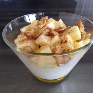 4 personnes : 1 grosse pomme, 400g de fromage blanc nature, 4 noix, 4 cuillères à café de miel, cannelle.